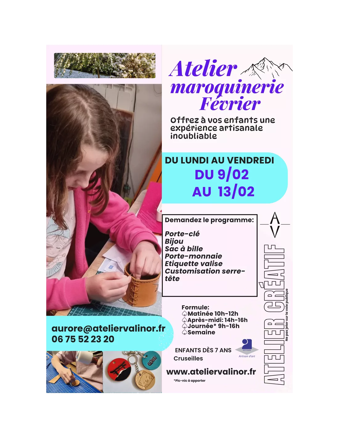 Plongez vos enfants dans l’univers fascinant du travail du cuir avec un stage créatif et ludique à l’Atelier Valinor, à Cruseilles. Du 9 au 13 février, ils apprendront à confectionner de véritables objets artisanaux : porte-clés, bijoux, petits sacs à billes, porte-monnaie, étiquettes pour valise, ou encore customisation de serre-têtes. Chaque projet est pensé pour être accessible et valorisant pour les enfants dès 7 ans.